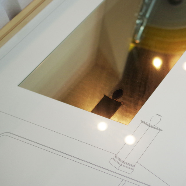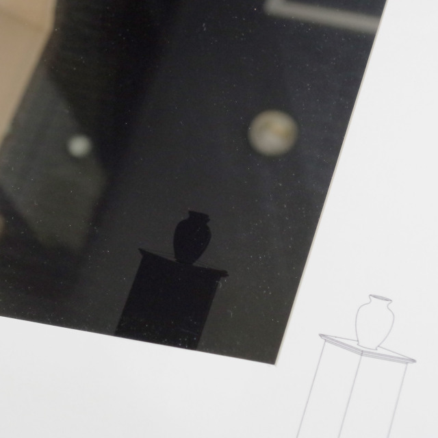 一見すると線描で描 かれた室内風景です。しかし自身のプロダクト「PEDESTAL VASE」が描かれた背後の壁にあるミラーは本物の鏡です。