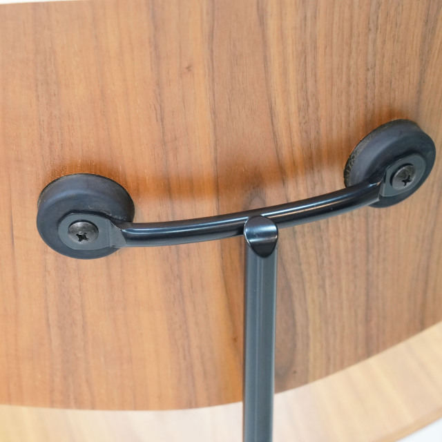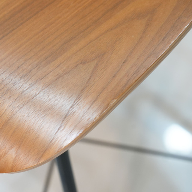 本製品はハーマンミラー現行正規品のイームズプライウッドチェアDCMのウォールナットのブラックベースの展示品です。一時期は普通に置いていたので人が座ったりしてスリ跡や細かいキズがあります。ここ数年は人が触らず置いてあるだけなので特に酷使はされていませんし座ることに問題もありません。