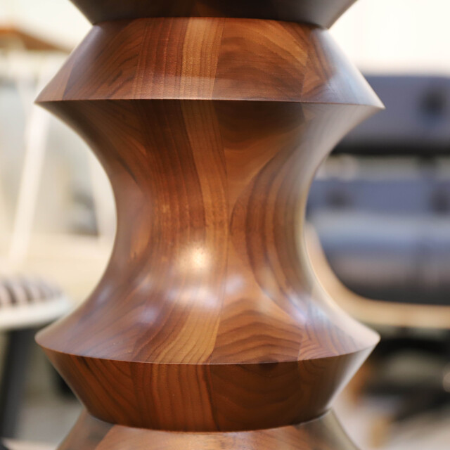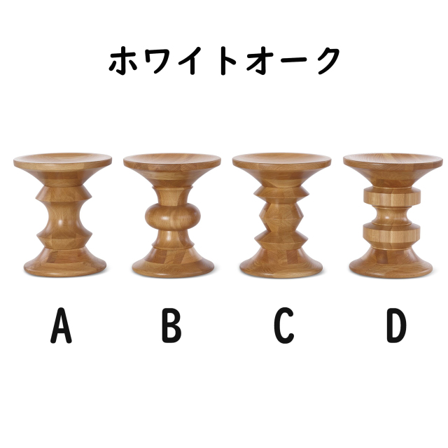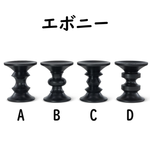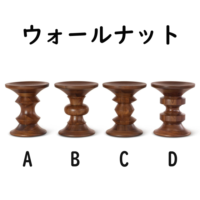 イームズウォールナットスツールの、デザインは3種類。すべて同じもので揃えるのも、各タイプから選ぶのも自由です。スツールはウォールナット材を旋盤で切削して作られています。