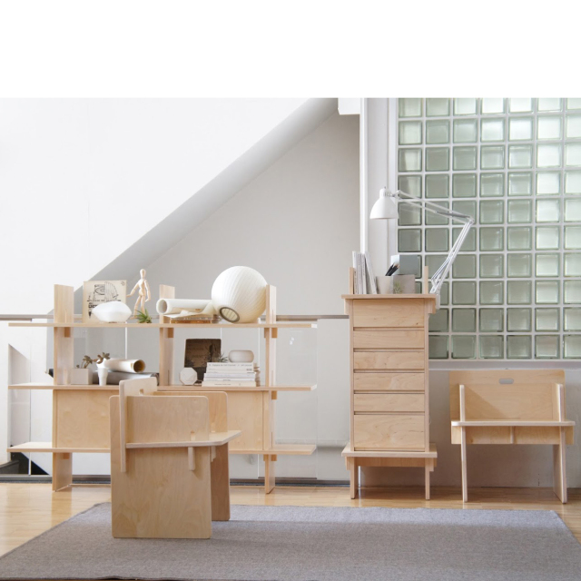 この「ジュニア」は切れ込みの入った積層合版をはめ込むだけで完成するシンプルな要素で構成されています。