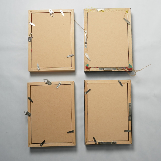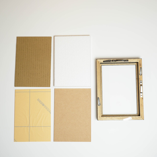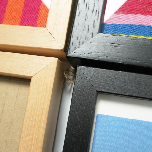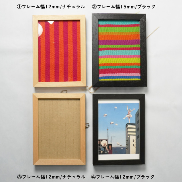 フレーム幅は15mmを使用し、裏側はギザギザの金具をつけることで押しピンや画鋲でもかけられるようにしています。