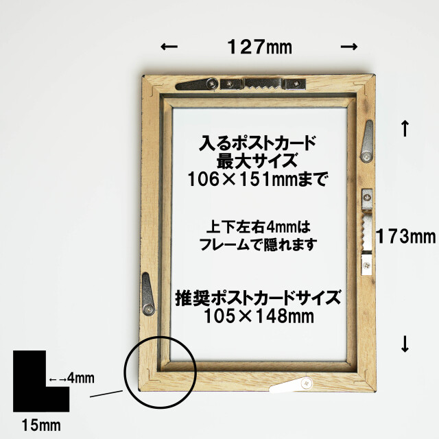 木製の上質なフレームの端材を利用し、厚さ1.5mmのアクリルを採用することでポストカードの色焼けがしづらくなっています。