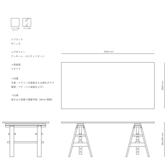 | サイズ | 幅2000 奥行1000 高655∼915 mm 天板/ 幅2000 奥行1000 厚25 mm 脚部/ 幅510 奥行860 高630∼890 mm |